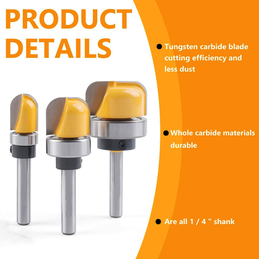 3Pcs Bowl & Tray Template Router Bit Set, 1/4″ Shank Carbide Round Nose with Bearing