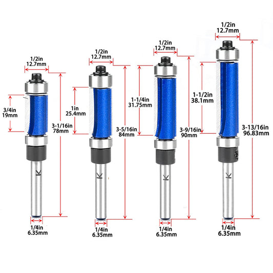 4-Piece Flush Trim Router Bits 3/4", 1", 1-1/4", 1-1/2" Cutting Length 1/4" Shank Carbide Top and Bottom Bearings for Woodworking