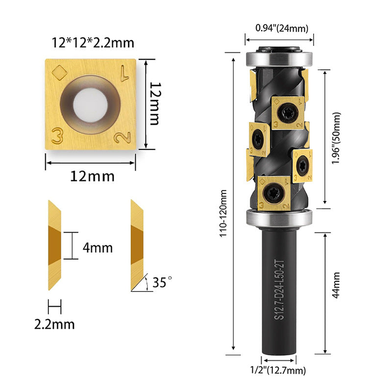 Bit Specs: Material: High-strength steel body + Carbide inserts Shank: 1/2 inch Application: CNC router, router table Usage: Trimming, flush cutting, precision woodworking