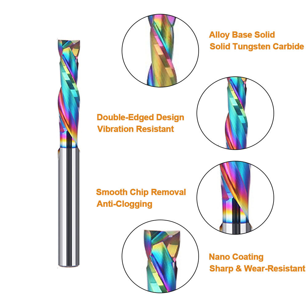 Bit Specs: Material: Solid Tungsten Carbide Coating: DLC Nano-Coating Number of Flutes: 2 (Double-Edged Spiral) Color: Rainbow Coating (as shown) Applications: Grooving, trimming, engraving, and slotting on acrylic, PVC, composite panels, MDF, and solid wood.